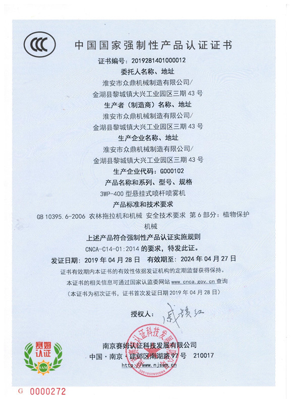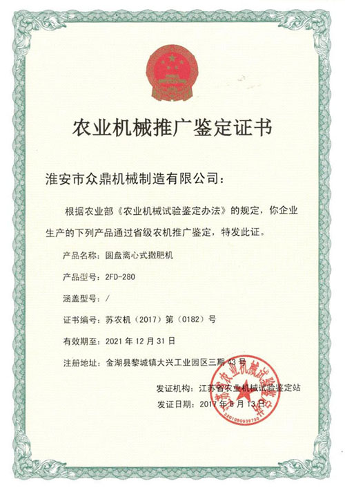 農(nóng)業(yè)機(jī)械推廣鑒定證書(shū)2FD-380