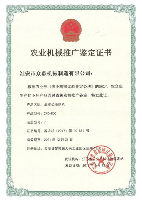 農(nóng)業(yè)機(jī)械推廣鑒定證書(shū)2FD-800